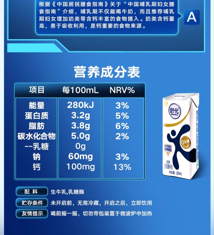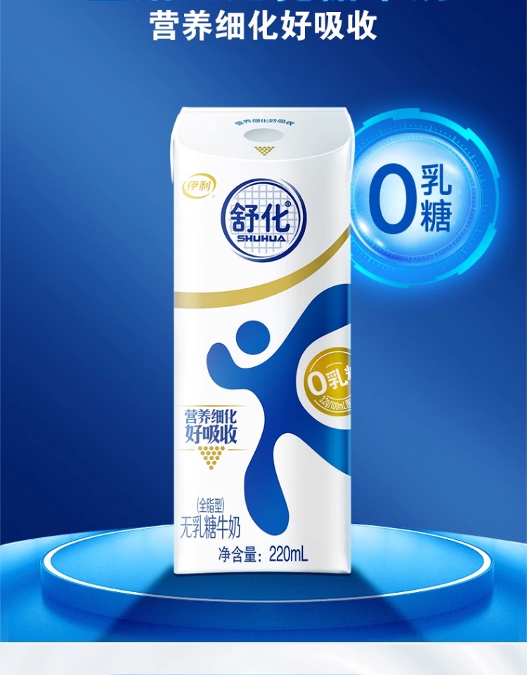 伊利舒化全脂无乳糖牛奶220ml*12盒整箱